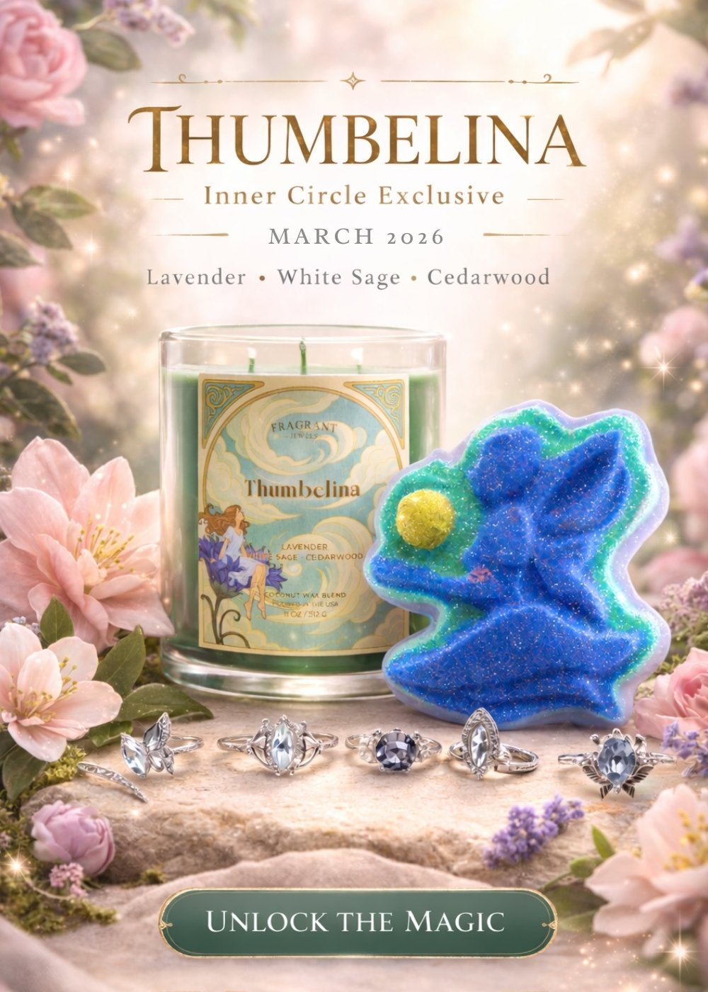 Available only to Inner Circle members, each month brings a themed Candle & Bath Bomb set—now elevated with newly designed jewelry created specifically for that collection inside every item.